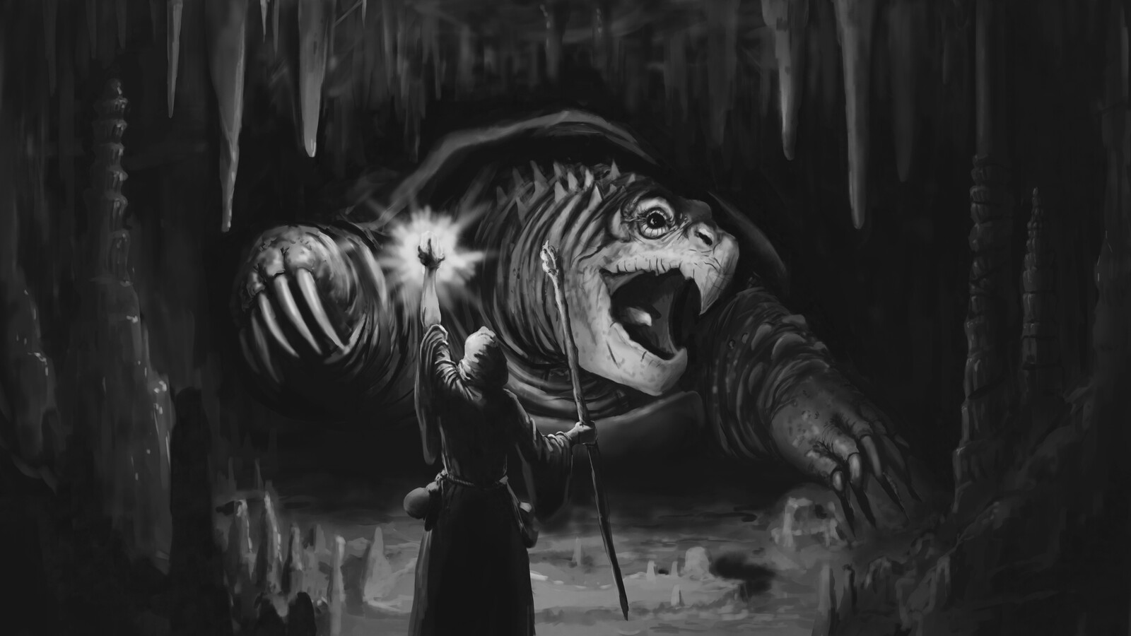 A wizard exploring a cave seeking forbidden knowledge runs into a giant turtle.